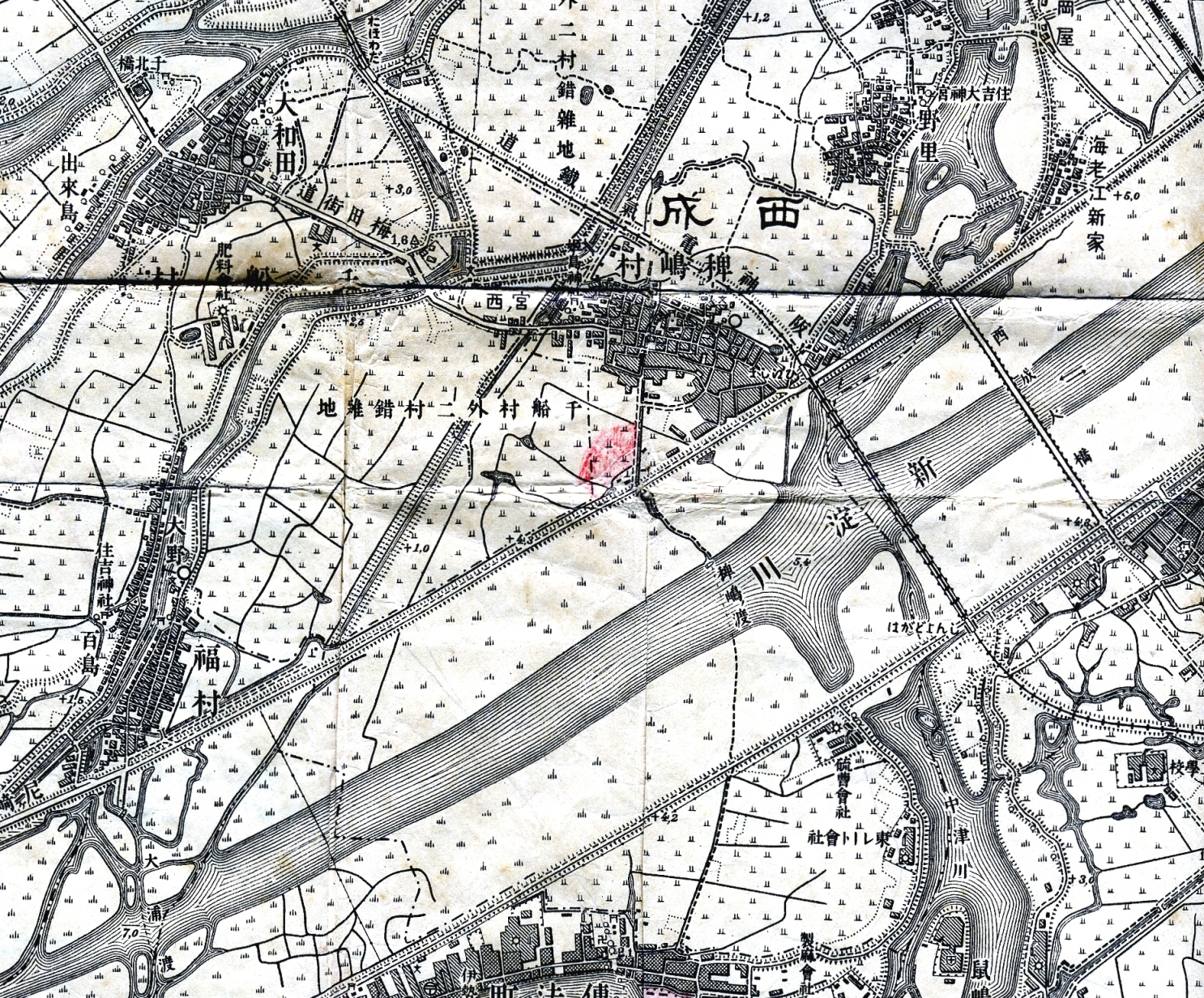 | 淀川右岸に接する「姫島」は明治時代「稗嶋村(ひえじまむら)」と呼ばれていて、大阪市内から兵庫県尼崎方面へ通じる陸上交通の中継地であった。淀川左岸の「傳法町」(現此花区伝法)から田圃の中の道を抜けると淀川の堤に出る。河川敷に降りると船着き場があって、これが地図にある「稗嶋ノ渡」である。渡し船で対岸へわたり、堤を超えると「稗嶋村」である。いつの時期に地名が「姫島」と変わったのかは知らないが、すでにこのとき「姫島神社」は存在していた。村の中心を西へ向かって街道が続く。これが「梅田街道」で、「大和田」の村の中へ続く道。阪神電車の駅は淀川左岸に「新淀川」駅、(現在は「淀川」駅)淀川右岸に「稗島」駅となっている。現在の「姫島」駅はこれより150メートルほど西寄りの位置になっている。淀川を渡る阪神電車の陸橋の北東上流に「西成大橋」が架かっている。これが現在の「国道2号線」の「淀川大橋」。ただ、これより西への「2号線」はこの当時まだ存在しない。「西成大橋」を渡って来る道は、堤防沿いを下って「稗嶋村」に入るルートと、そのまま「野里」へ向かう道とに分かれる。この「野里」へ向かう道がのちの「国道2号線」のルーツとなるようである。 |