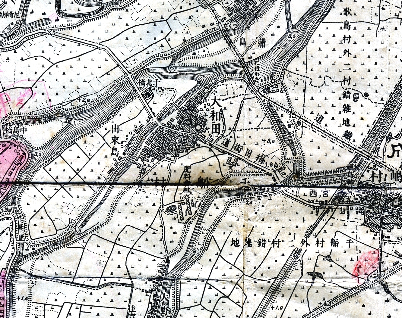 明治末期の大和田地区の地図を見ると、村の中心部に「村役場」があり、当時の幹線道路「梅田街道」が村の中心を横断しています。街道沿いに学校がありますが、現在の「大和田小学校」と思われます。村の外れの南方向に「肥料会社」、北方向に阪神電車の駅が「おほわだ」という名前で存在していたことがわかります。おそらくこの当時「大和田」はこの地域の行政や商業の中心地であっただろうと想像できます。